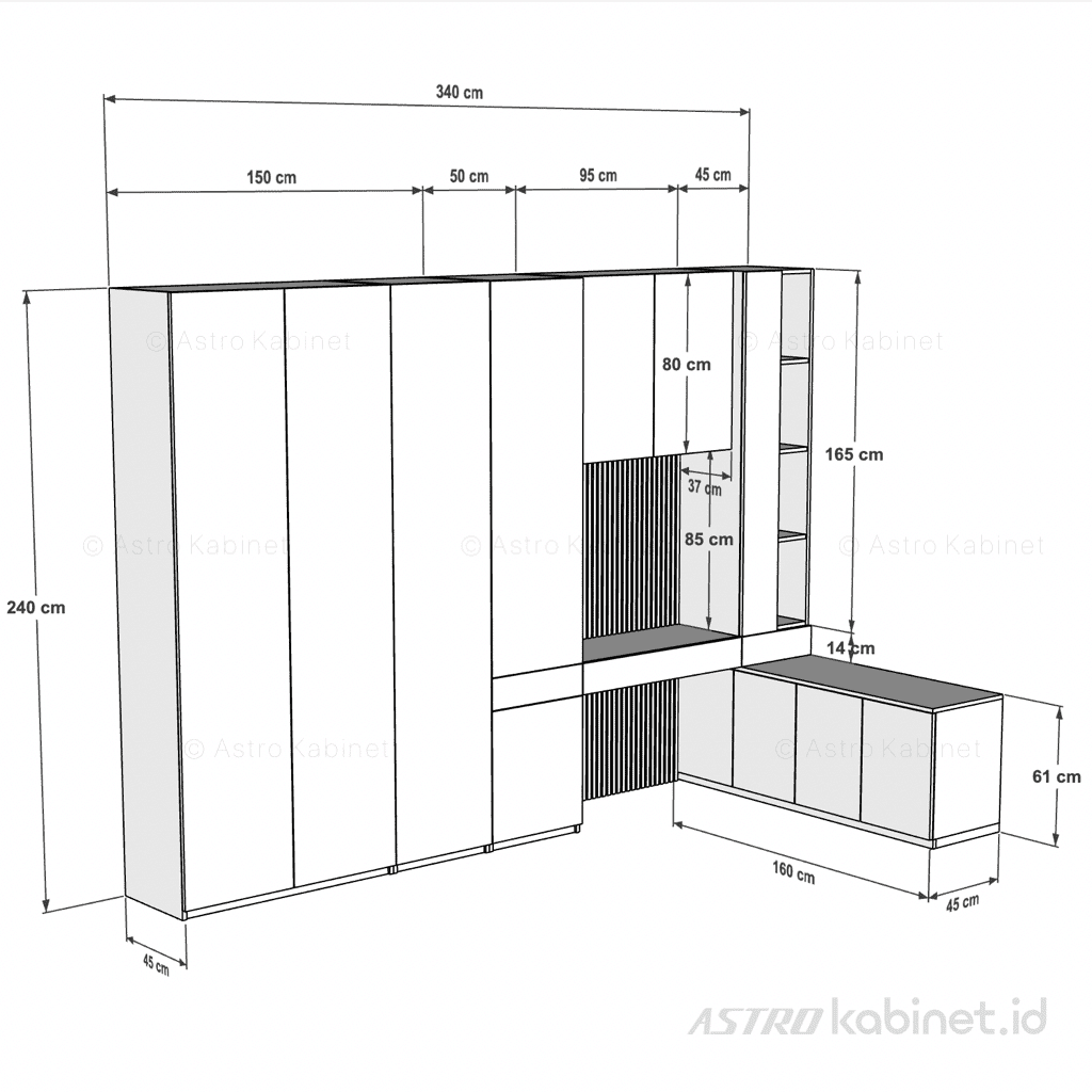 Lemari kombinasi meja rias/belajar, Bentuk L untuk ruangan 340x160cm